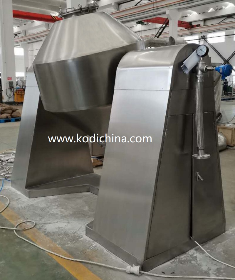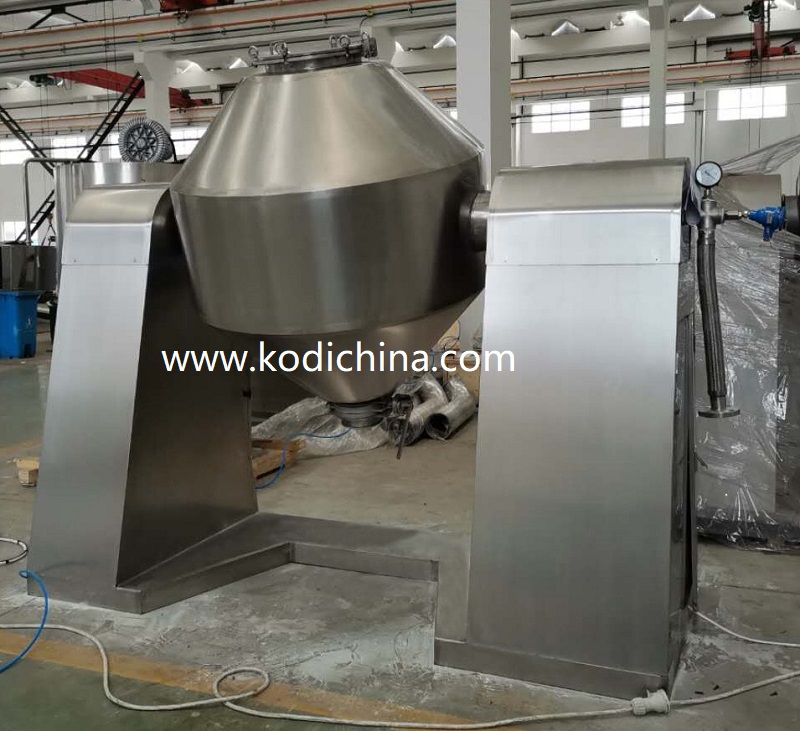 The double cone rotary vacuum dryer has a double-cone rotary tank body. In the vacuum state, steam or hot water is passed into the jacket for heating. The heat is in contact with the wet material through the inner wall of the tank. After the wet material absorbs heat, the evaporated vapor is pumped away by the vacuum pump through the vacuum exhaust pipe. Because the tank is in a vacuum state, and the rotation of the tank makes the material constantly turn up and down, it speeds up the drying speed of the material, improves the drying efficiency, and achieves the purpose of uniform drying.